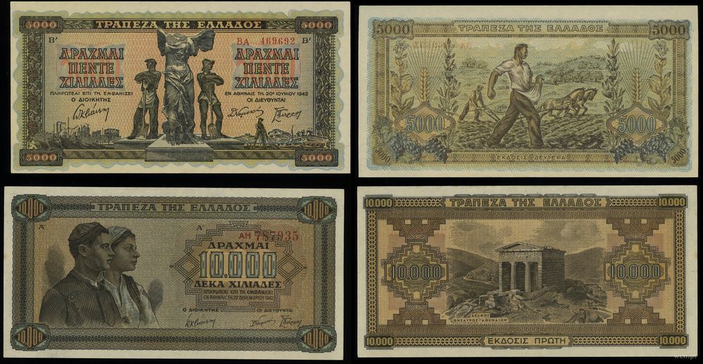 | Opis: | Grecja - Τραπεζα τηε Ελλαδοσ / Bank of Greece, zestaw 4 banknotów, 1942–1943, 1) 1.000 drachm, 21.08.1942 2) 10.000 drachm, 29.12.1942 3) 5.000 drachm, 20.06.1942 4) 5.000 drachm, 19.07.1943 |