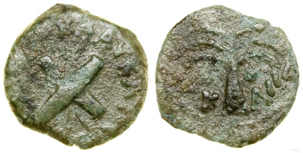 | Opis: | Rzym prowincjonalny - Judea - prokurator Antoniusz Feliks 52–60 ne, prutah, (52–60 ne), Jerozolima, Aw: Skrzyżowane długie tarcze oraz włócznie, legenda, Rw: Drzewo palmowe, niewidoczna data |