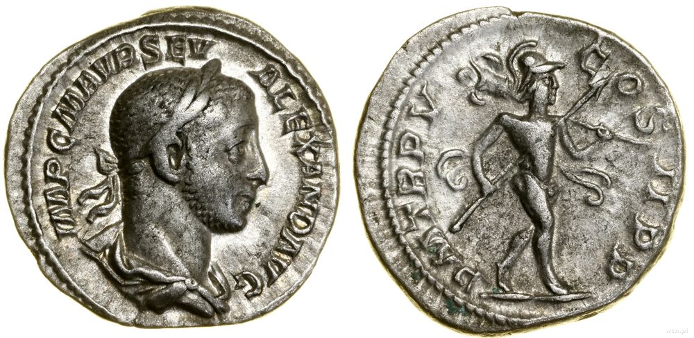 | Opis: | Cesarstwo Rzymskie - Aleksander Sewer (222–235), denar, (226), Rzym, Aw: Popiersie cesarza w wieńcu laurowym w prawo, IMP C M AVR SEV ALEXAND AVG, Rw: Mars z włócznią i trofeum kroczący w prawo, P M TR P V COS II P P |