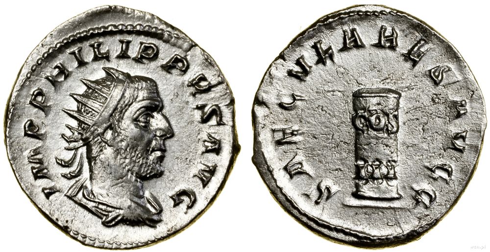 | Opis: | Cesarstwo Rzymskie - Filip I Arab (244–249), antoninian, (248), Rzym, Aw: Popiersie cesarza w koronie radialnejw prawo, IMP PHILIPPVS AVG, Rw: Niska kolumna z napisem COS III, SAECVLARES AVGG |