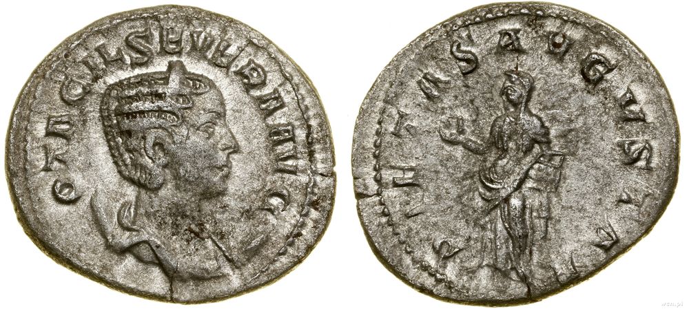| Opis: | Cesarstwo Rzymskie - Otacilla Sewera (żona Filipa I) (244–249), antoninian, (244–249), Rzym, Aw: Popiersie cesarzowej w prawo, OTACIL SEVERA AVG; Rw: Pietas stojąca w prawo z wyciągniętą ręką, trzymająca pudełko perfum, PIETAS AVGVSTAE |