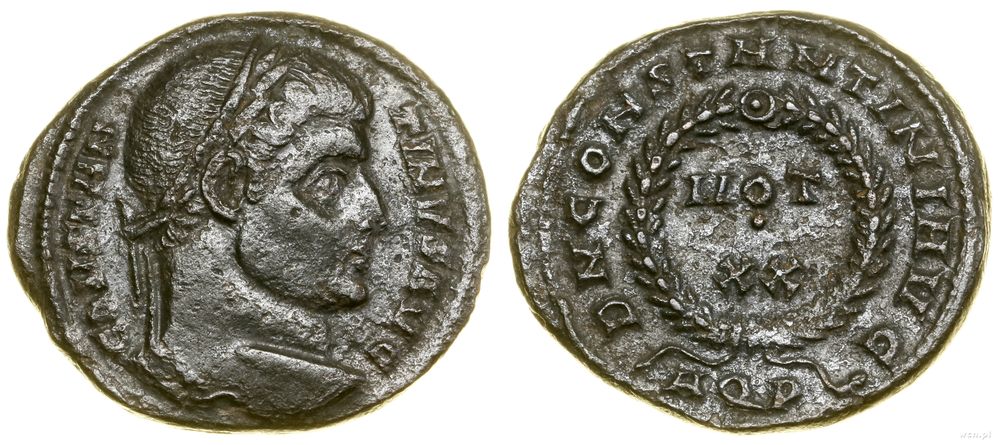 | Opis: | Cesarstwo Rzymskie - Konstantyn I Wielki (307–337), follis, 321, Aquileia, Aw: Popiersie cesarza w prawo, CONSTANTINVS AVG, Rw: W wieńcu VOT / XX, w otoku, w odcinku •AQP•, D N CONSTANTINI MAX AVG |