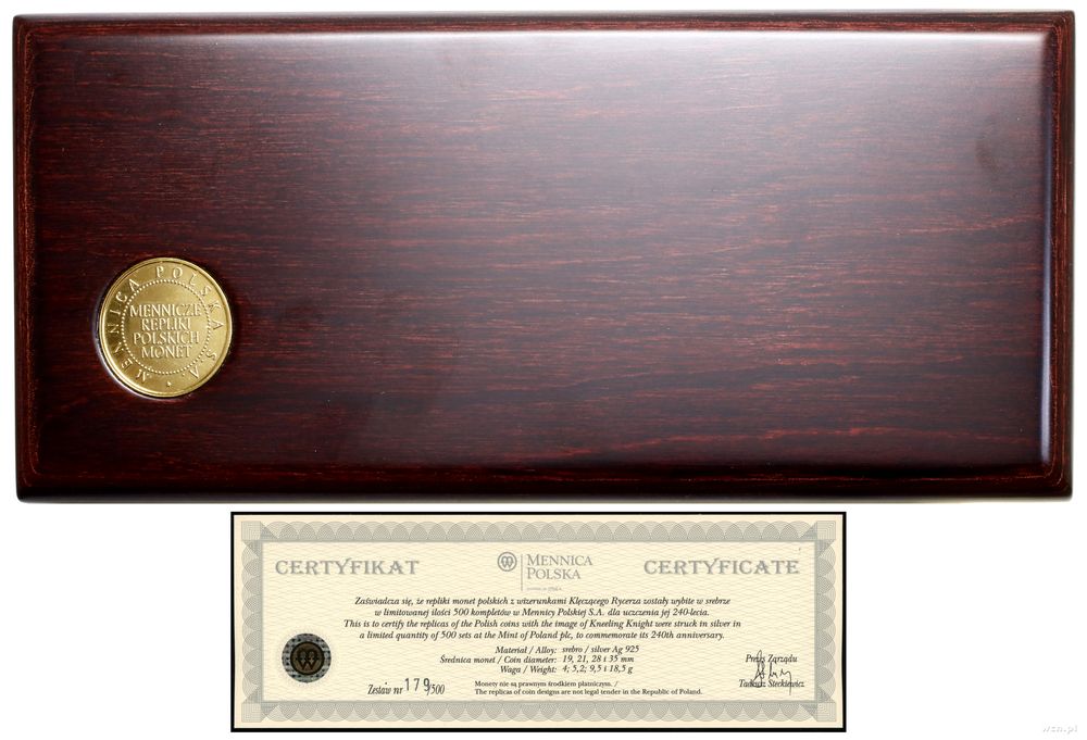 | Opis: | Polska - kopie monet, zestaw 4 replik, 2006, Warszawa, w skład zestawu wchodzi 10, 20, 50, 100 złotych bitych stemplami wzorowanymi na stemplach monet typu Klęczący Rycerz |