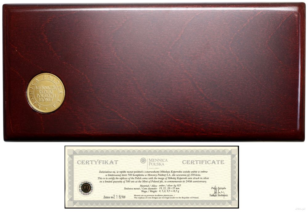 | Opis: | Polska - kopie monet, zestaw 4 replik, 2006, Warszawa, w skład zestawu wchodzi 10, 20, 50, 100 złotych bitych stemplami wzorowanymi na stemplach monet z wizerunkiem Mikołaja Kopernika |