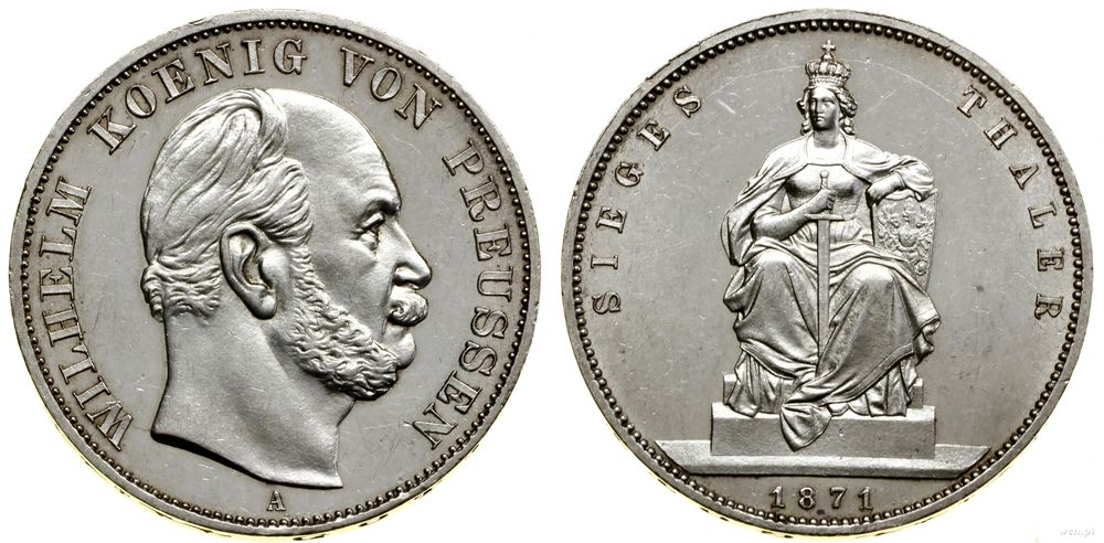 | Opis: | Niemcy - Prusy – królestwo (1701–1918) - Wilhelm I (1861–1888), talar (Siegestaler), 1871 A, Berlin, wybity z okazji wygranej wojny francusko-pruskiej |