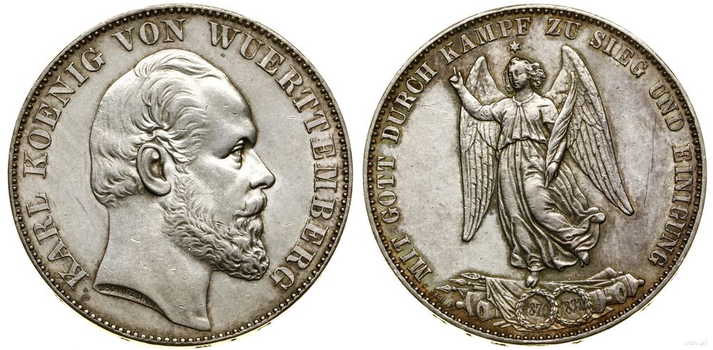 | Opis: | Niemcy - Wirtembergia - Karol (1864–1891), talar (Vereinstaler), 1871, Stuttgart, wybity z okazji zwycięstwa w wojnie francusko-pruskiej |