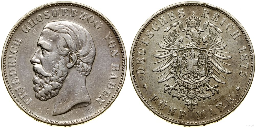 | Opis: | Niemcy - Badenia - Fryderyk I (1856–1907) - system markowy, 5 marek, 1875 G, Karlsruhe |