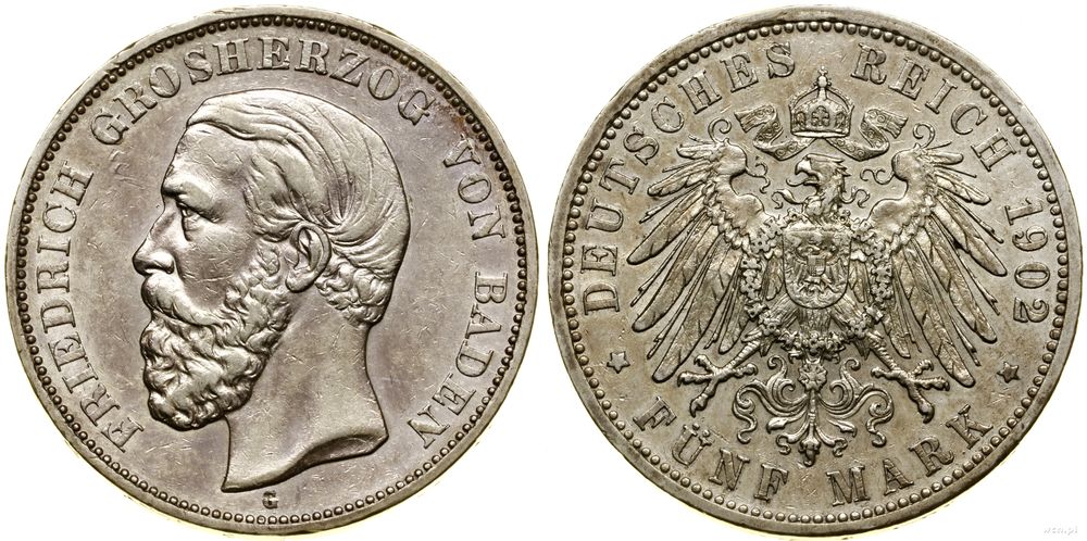 | Opis: | Niemcy - Badenia - Fryderyk I (1856–1907) - system markowy, 5 marek, 1902 G, Karlsruhe |
