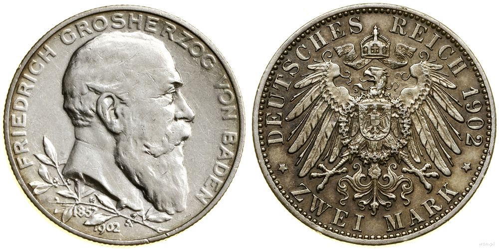 | Opis: | Niemcy - Badenia - Fryderyk I (1856–1907) - system markowy, 2 marki, 1902, Karlsruhe, wybite na 50. rocznicę panowania |