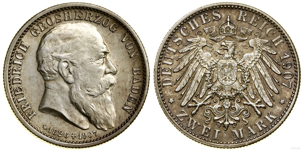 | Opis: | Niemcy - Badenia - Fryderyk I (1856–1907) - system markowy, 2 marki pośmiertne, 1907, Karlsruhe |
