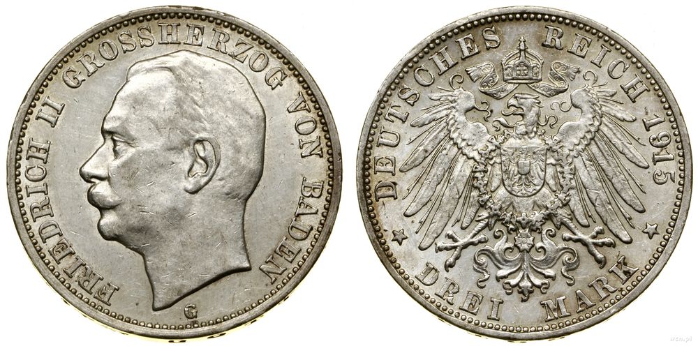 | Opis: | Niemcy - Badenia - Fryderyk II (1907–1918), 3 marki, 1915 G, Karlsruhe |