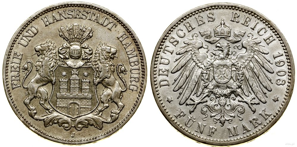 | Opis: | Niemcy - Hamburg – miasto - system markowy, 5 marek, 1908 J, Hamburg |