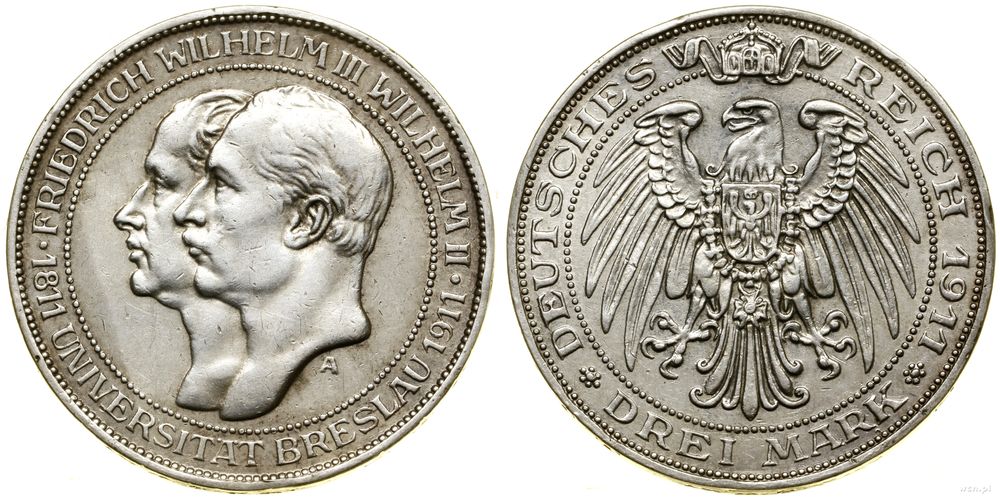 | Opis: | Niemcy - Prusy – królestwo (1701–1918) - Wilhelm II (1888–1918), 3 marki, 1911 A, Berlin, 100-lecie Uniwersytetu we Wrocławiu |