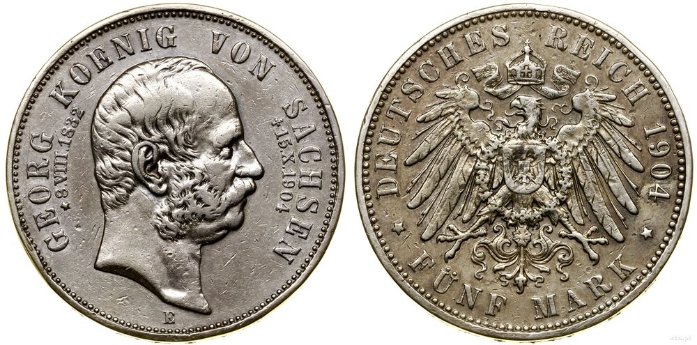 | Opis: | Niemcy - Saksonia - linia albertyńska (1547–1918) - Jerzy (1902–1904), 5 marek pośmiertne, 1904 E, Muldenhütten |