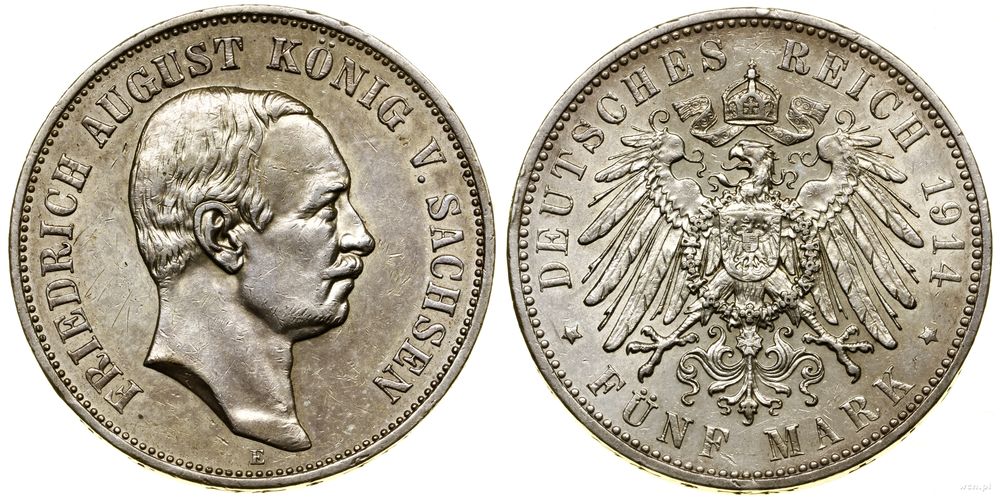 | Opis: | Niemcy - Saksonia - linia albertyńska (1547–1918) - Fryderyk August III (1904–1918), 5 marek, 1914 E, Muldenhütten |