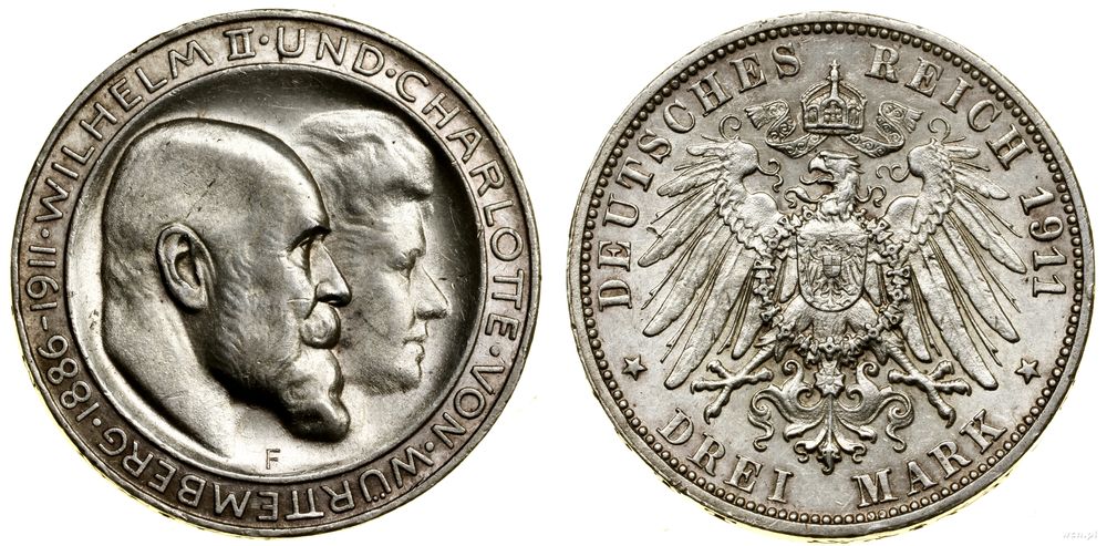 | Opis: | Niemcy - Wirtembergia - Wilhelm II (1891–1918), 3 marki, 1911 F, Stuttgart |
