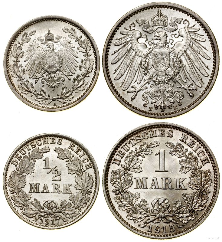| Opis: | Cesarstwo Niemieckie, zestaw 2 monet, 1 marka 1915 E, Muldenhütten / 1/2 marki 1917 A, Berlin |
