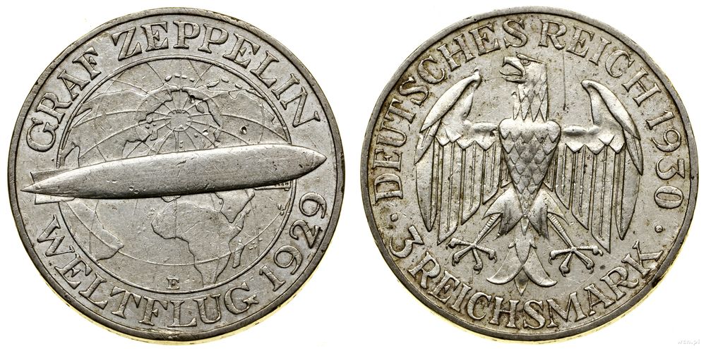 | Opis: | Niemcy - Republika Weimarska (1918–1933), 3 marki, 1930 E, Muldenhütten, sterowiec Graf Zeppelin |