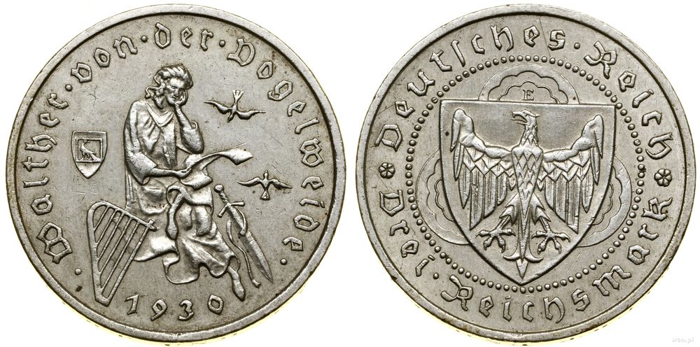 | Opis: | Niemcy - Republika Weimarska (1918–1933), 3 marki, 1930 E, Muldenhütten, 700. rocznica śmierci Walthera von der Vogelweide |