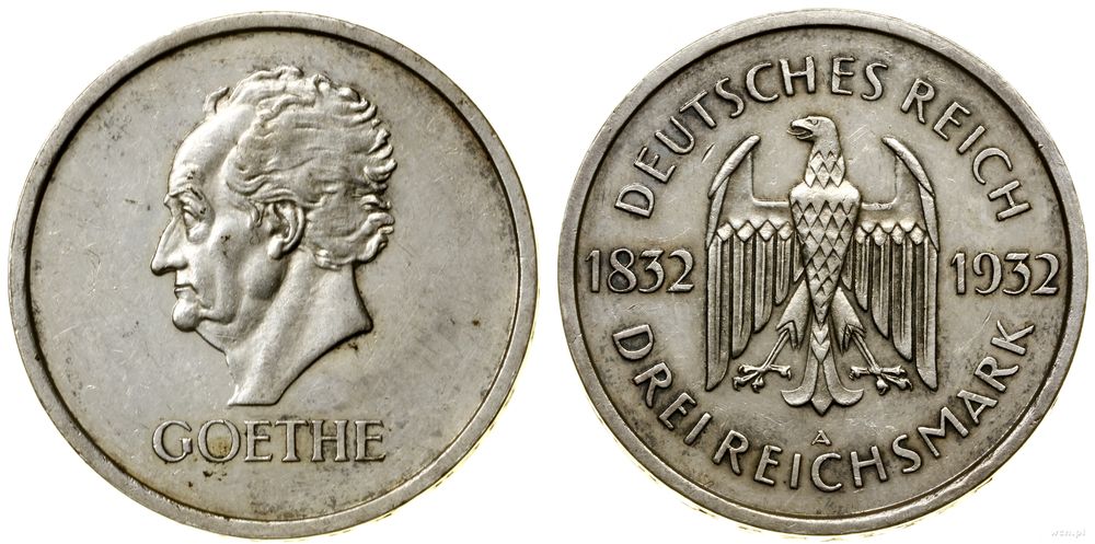 | Opis: | Niemcy - Republika Weimarska (1918–1933), 3 marki, 1932 A, Berlin, 100. rocznica śmierci Johanna Wolfganga von Goethe |