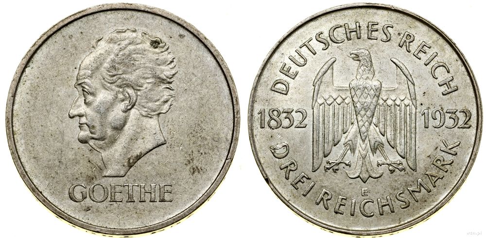 | Opis: | Niemcy - Republika Weimarska (1918–1933), 3 marki, 1932 E, Muldenhütten, 100. rocznica śmierci Johanna Wolfganga von Goethe |