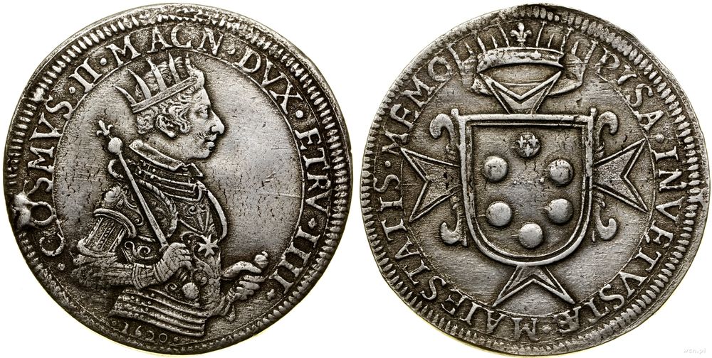 | Opis: | Włochy - Toskania - Cosmo II (1608–1621), talar, 1620, Piza, Aw: Półpostać władcy trzymającego rękojeść miecza oraz berło w prawo, COSMVS II MAGN DVX ETR IIII, Rw: Na krzyżu maltańskim tarcza herbowa, powyżej korona, PISA INVETVSTAE MAIESTATIS MEMOR |