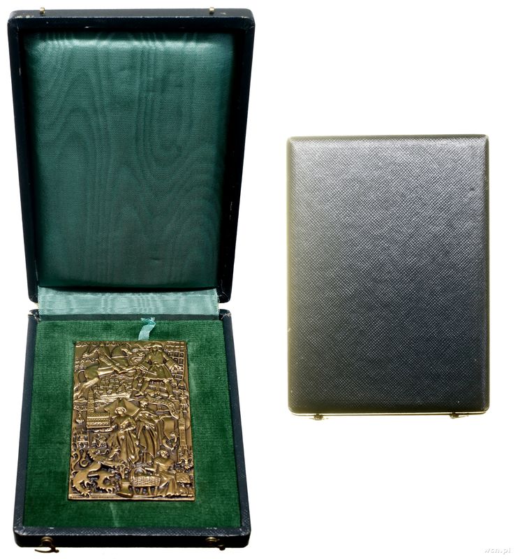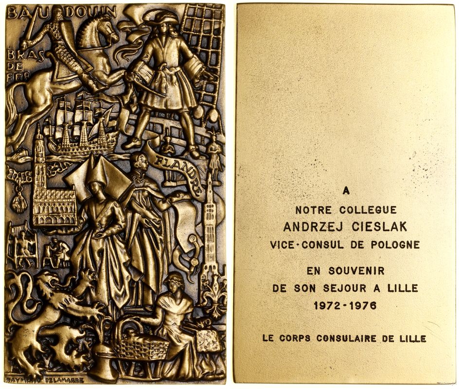 | Opis: | Francja, plakieta pamiątkowa, 1976, Paryż, Kompozycja złożona m.in. z Baldwina w zbroi na koniu, marynarza na statku, ludzi w strojach flamandzkich, Lwa Flandrii czy haftującej kobiety z dzieckiem przy boku, na dole sygnatura RAYMOND DELAMARRE, na stronie odwrotnej wygrawerowane A / NOTRE COLLEGUE / ANDRZEJ CIESLAK / VICE • CONSUL DE POLOGNE / EN SOUVENIR / DE SON SEJOUR A LILLE / 1972-1976 / LE CORPS CONSULAIRE DE LILLE, na obrzeżu trójkątna punca oraz BRONZE |