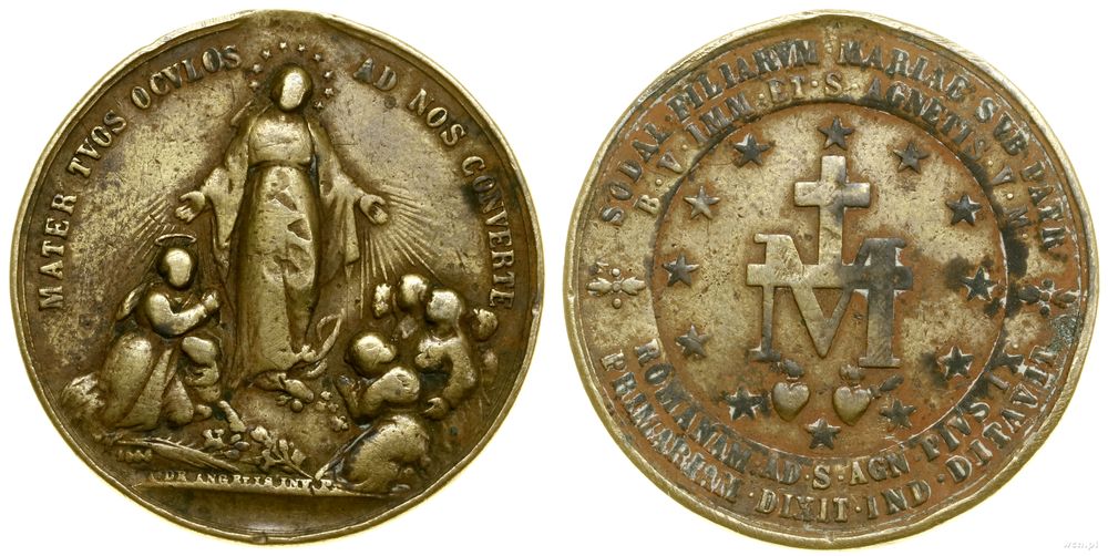 | Opis: | Dewocjonalia, medalik Maryjny, 1866, sygnowany A DE ANGELIS; Aw: Matka Boża błogosławiąca wiernych, poniżej data, MATER TVOS OCVLOS AD NOS CONVERTE; Rw: Symbol Maryjny, poniżej dwa serca: Serce Jezusa i Niepokalane Serce Maryi, całość otoczona gwiazdami, w otoku legenda |