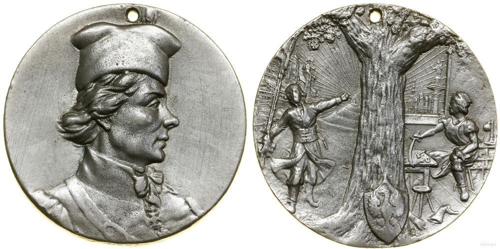 | Opis: | Polska - Polska pod zaborami (1795–1918), medal na 100. rocznicę Powstania Kościuszkowskiego (późniejszy odlew), 1894, Aw: Popiersie Kościuszki w czamarze w prawo, Rw: Dąb, na pniu tarcza z Orłem, z lewej stojący kosynier, z prawej szabelnik w warsztacie, w tle Zamek na Wawelu i kopiec Kościuszki nad którym wstaje słońce oraz Plac Zamkowy w Warszawie |
