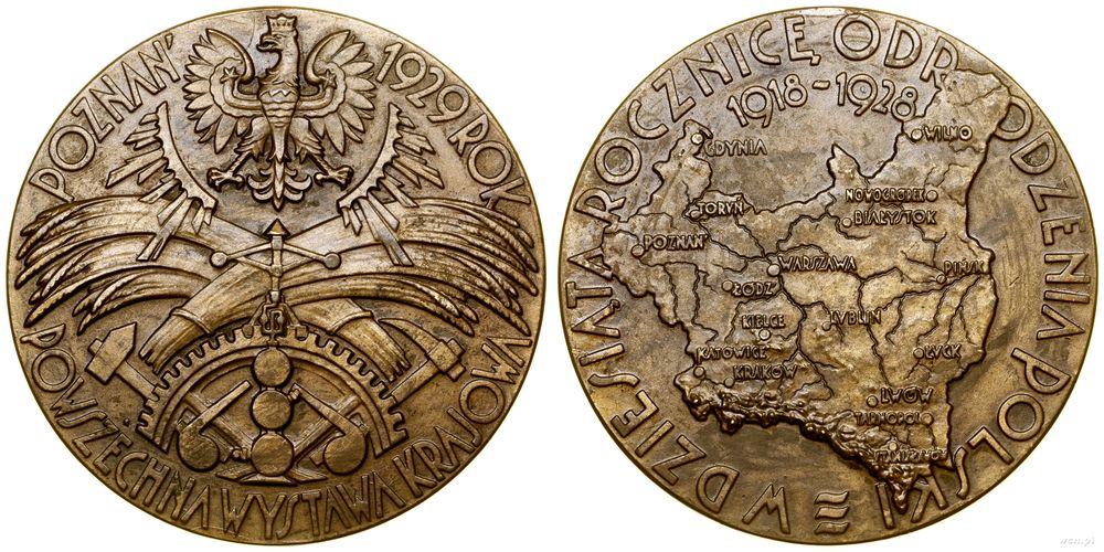 | Opis: | Polska - II Rzeczpospolita Polska (1918–1939), Powszechna Wystawa Krajowa w Poznaniu, 1929, Warszawa, Aw: Kompozycja z symboli przemysłu i rolnictwa, wyżej Orzeł państwowy, w otoku POWSZECHNA WYSTAWA KRAJOWA - POZNAŃ 1929 ROKU, Rw: Mapa Polski z naniesionymi miastami i siecią rzek, w otoku W DZIESIĄTĄ ROCZNICĘ ODRODZENIA POLSKI 1918-1928, medal niesygnowany, projektował Stefan Rufin Koźbielewski |