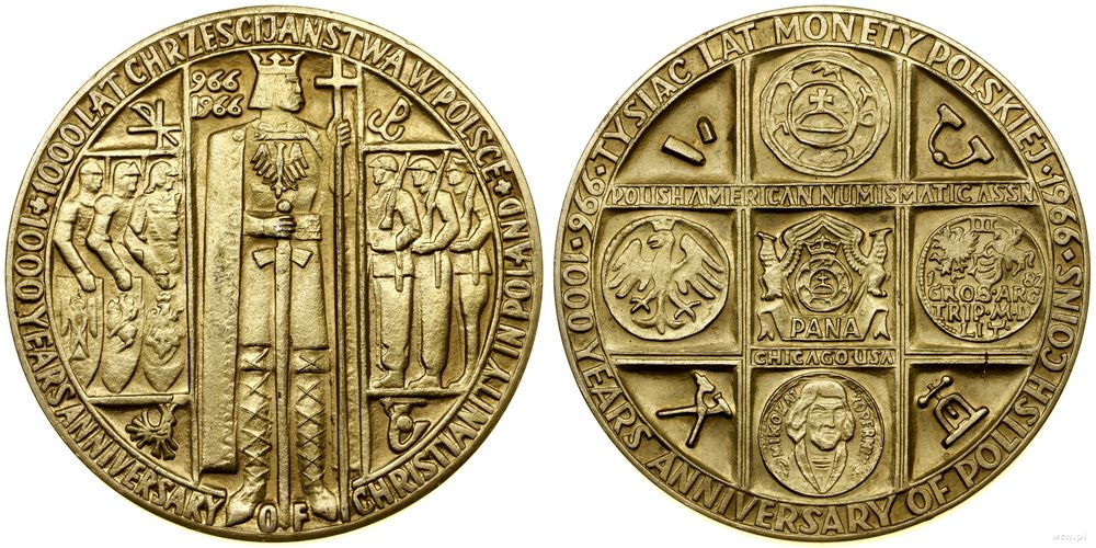 | Opis: | Polska - Polska Rzeczpospolita Ludowa (1952–1989), medal pamiątkowy z okazji 1000 lat chrześcijaństwa, 1966, Warszawa, Aw: Postać w zbroi i płaszczu z głową w koronie, zwróconą w prawo, w prawej ręce trzyma miecz, w lewej laskę krzyżową, z boków rycerze i żołnierze, w kątach godło Polski Walczącej, Warszawska Syrena, ptak z denara Bolesława Chrobrego i chrystogram, w otoku + 1000 LAT CHRZEŚCIJAŃSTWA W POLSCE + - 1000 YEARS ANNIVERSARY - OF - CHRISTIANITY IN POLAND, Rw: Herb PANA, wokół przedstawienia monet, w kątach narzędzia mincerskie, między nimi POLISH AMERICAN NUMISMATIC ASSN / CHICAGO USA, w otoku 966 - TYSIĄC LAT MONETY POLSKIEJ - 1966 - 1000 YEARS ANNIVERSARY OF POLISH COINS, medal projektu W. Kowalika i W Gawrona, wybity w Mennicy Warszawskiej na zlecenie PANA Chicago |