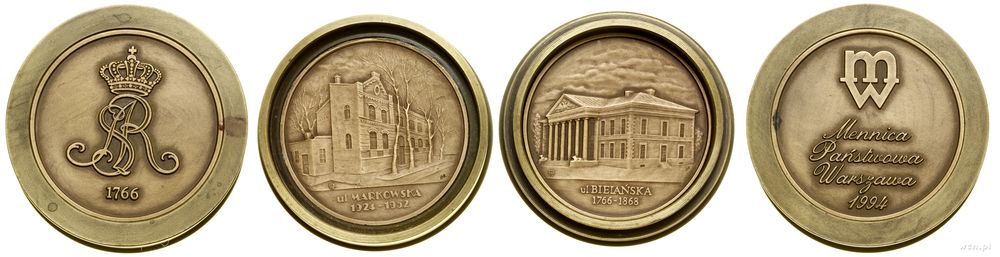 | Opis: | Polska - III Rzeczpospolita Polska (od 1989), Gmachy Mennicy 1766–1994, 1994, Warszawa, Trzyczęściowy medal w kapslu, przedstawiający gmachy Mennicy Państwowej od 1766. Na medalu: UL BIELAŃSKA 1766-1868, UL MARKOWSKA 1924-1952, UL. I.L. PERECA 1952, UL ŻELAZNA 1994, projektowali i wykonali Andrzej i Rosana Nowakowscy |