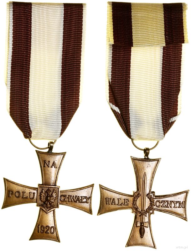 | Opis: | Polska - XX wiek - II RP na emigracji, Krzyż Walecznych 1920, 1943(?)–1945, Wielka Brytania, Krzyż kawalerski, na ramionach NA - POLU - CHWAŁY - 1920, na środku tarcza z Orłem, na stronie odwrotnej miecz na którym wieniec, po bokach WALE - CZNYM, krzyż jednoczęściowy, mocowany na wstążkę |