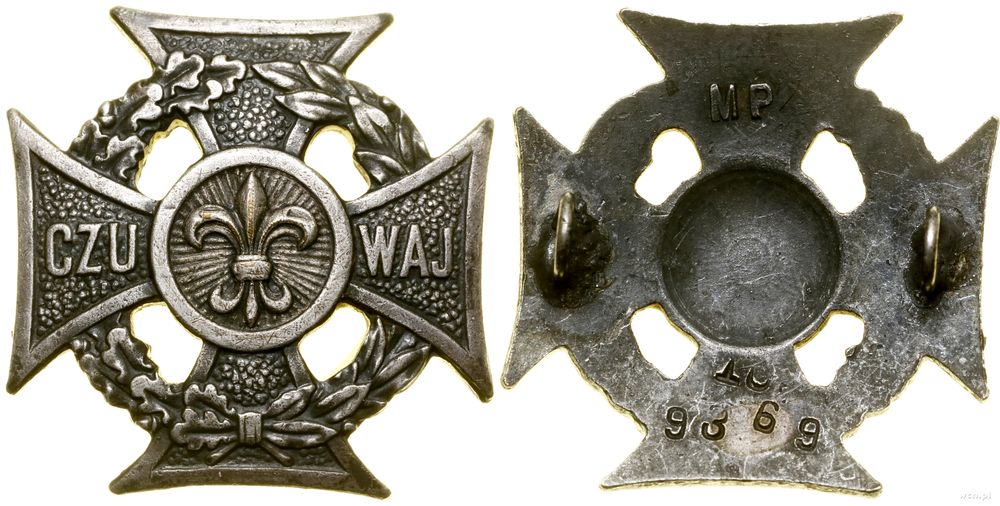 | Opis: | Polska - Polska Rzeczpospolita Ludowa (1952–1989), Krzyż Harcerski Żeński, 1957–1965, Warszawa, Krzyż, w kątach wieniec, na poziomej belce CZU - WAJ, w medalionie lilia w promieniach, na stronie odwrotnej MP / IO / 9369, odznaka jednoczęściowa, mocowana na uszka, wykonana w Mennicy Państwowej |