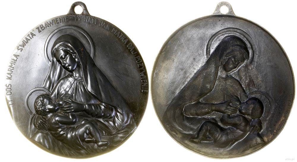 | Opis: | Polska - XX w. - II Rzeczpospolita Polska (1918–1939), plakieta z Matką Bożą Karmiącą, 1925, Matka Boża Karmiąca, TY COŚ KARMIŁA ŚWIATA ZBAWIENIE - TY NAM JAK MATKA DAJ POŻYWIENIE, na stronie odwrotnej A. TYBLEWSKI / WARSZAWA / NAŚLADOW. ZASTRZEŻONE |