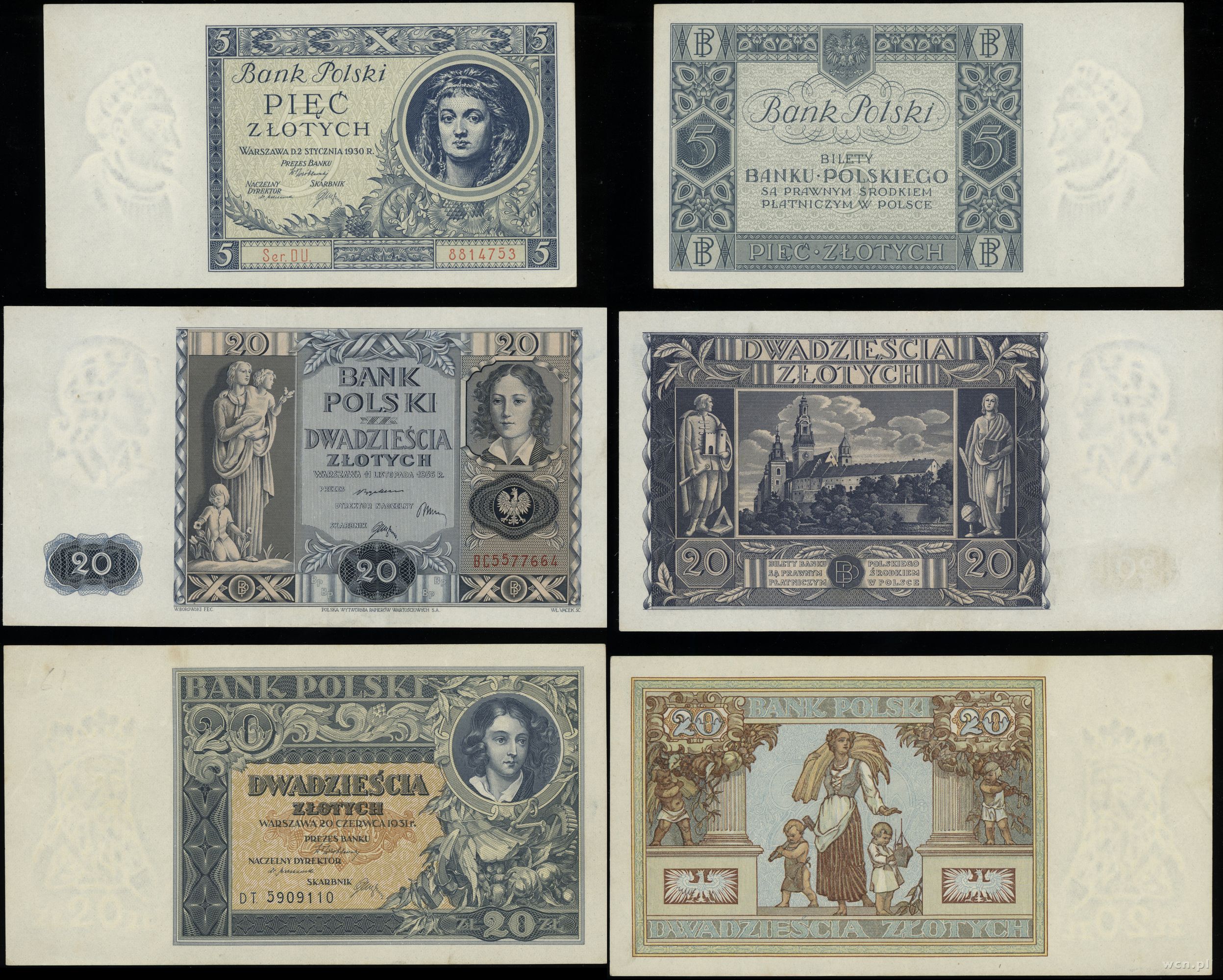 1) 5 złotych 2.01.1930 seria DU 2) 20 zlotych 20.06.1931 ... | II/III+ |