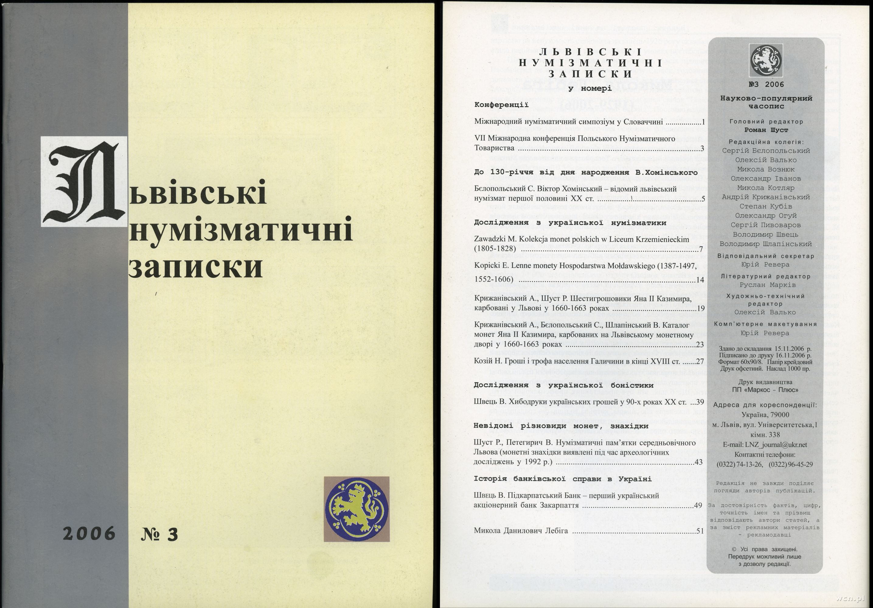 czasopisma, Львiвськi нумiзматичнi записки (Lwowskie Zapiski Numizmatyczne), nr 3/2006