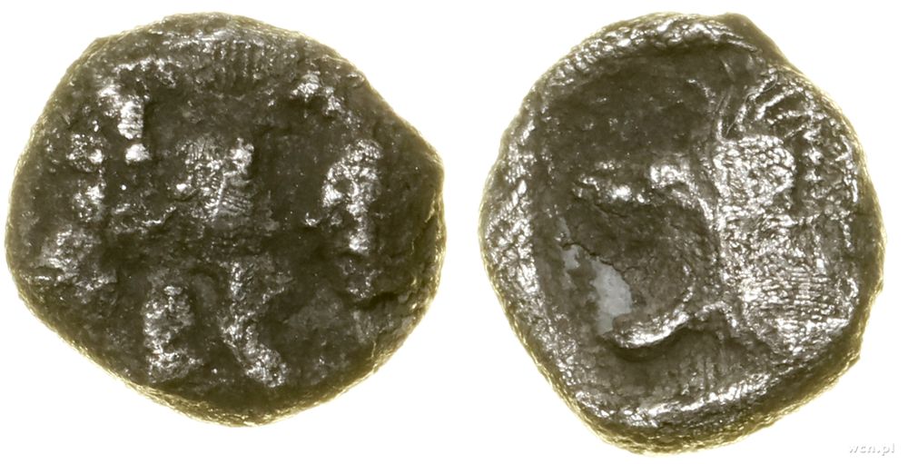 | Opis: | Grecja i posthellenistyczne - Myzja - Kyzikos, hemiobol, (V w. pne), Aw: Protom dzika w lewo, Rw: W kwadracie incusum głowa lwa w lewo |