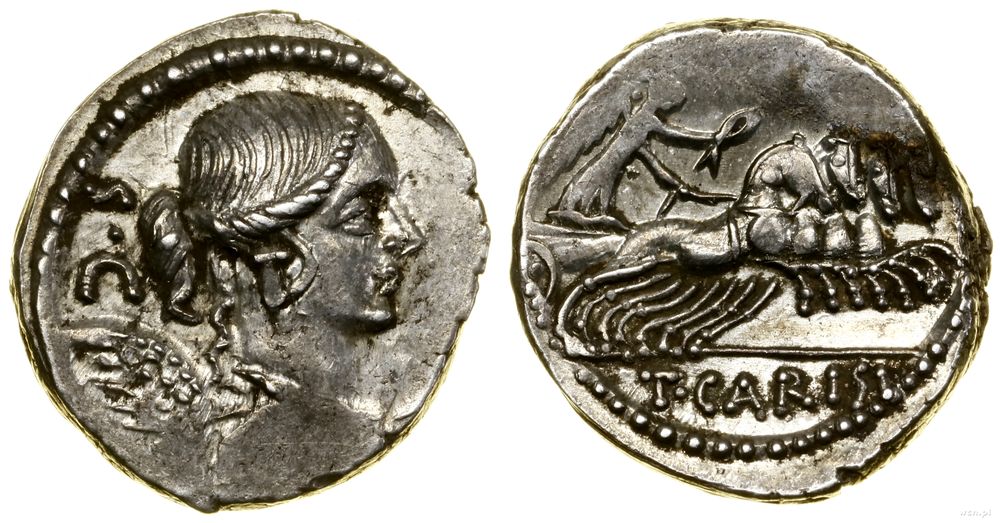 | Opis: | Republika Rzymska - T. Carisius (46 pne), denar, 46 pne, Rzym, Aw: Głowa Wiktorii w prawo, z lewej SC, Rw: Wiktoria trzymająca lejce i wieniec, w kwadrydze w prawo, w odcinku legenda T CARISI |