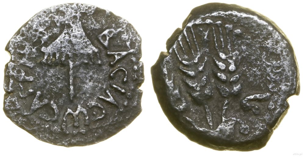 | Opis: | Rzym prowincjonalny - Judea - Dynastia Herodiańska - Agryppa I (37–44 ne), prutah, (42–43 ne), Jerozolima, Aw: Baldachim o kształcie parasola, wokoło legenda, Rw: Trzy kłosy zboża, po bokach data L-ς(?) (rok 6?) |