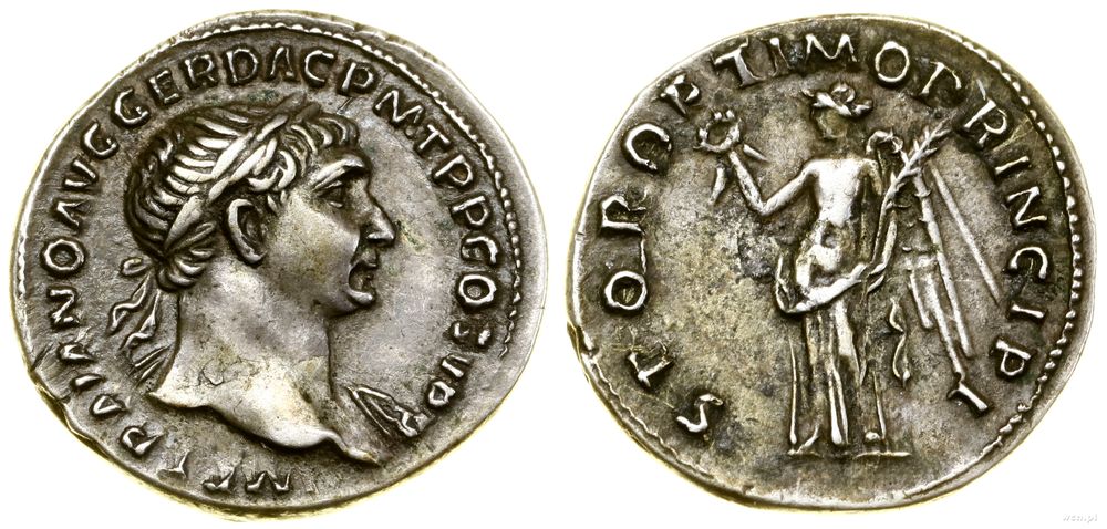 | Opis: | Cesarstwo Rzymskie - Trajan (98–117), denar, (103–111), Rzym, Aw: Popiersie Trajana w wieńcu laurowym w prawo, IMP TRAIANO AVG GER DAC P M TR P COS V P P, Rw: Wiktoria stojąca w lewo, trzymająca wieniec oraz liście palmy, S P Q R OPTIMO PRINCIPI |