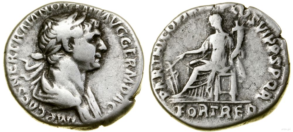| Opis: | Cesarstwo Rzymskie - Trajan (98–117), denar, (114–117), Rzym, Aw: Popiersie władcy w prawo, IMP CAES NER TRAIAN OPTIM AVG GERM DAC, Rw: Fortuna siedząca w lewo, trzymająca ster i róg obfitości, PARTHICO P M TR P COS VI P P S P Q R, w odcinku FORT RED |