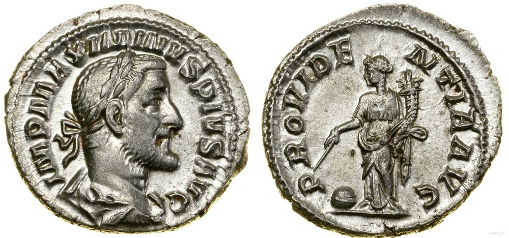 | Opis: | Cesarstwo Rzymskie - Maksymin I Trak (235–238), denar, (235–236), Rzym, Aw: Popiersie cesarza w wieńcu laurowym w prawo, IMP MAXIMINVS PIVS AVG, Rw: Providentia stojąca w lewo z różdżką i rogiem obfitości, u stóp glob, PROVIDENTIA AVG |