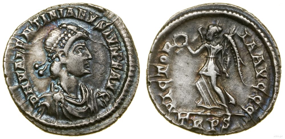 | Opis: | Cesarstwo Rzymskie - Walentynian II (375–392), silikwa, (375–383), Trewir, Aw: Popiersie władcy w prawo, D N VALENTINIANVS IVN P F AVG, Rw: Wiktoria krocząca w lewo, trzymająca wieniec i gałązkę palmową, VICTORIA AVGGG, w odcinku TRPS |
