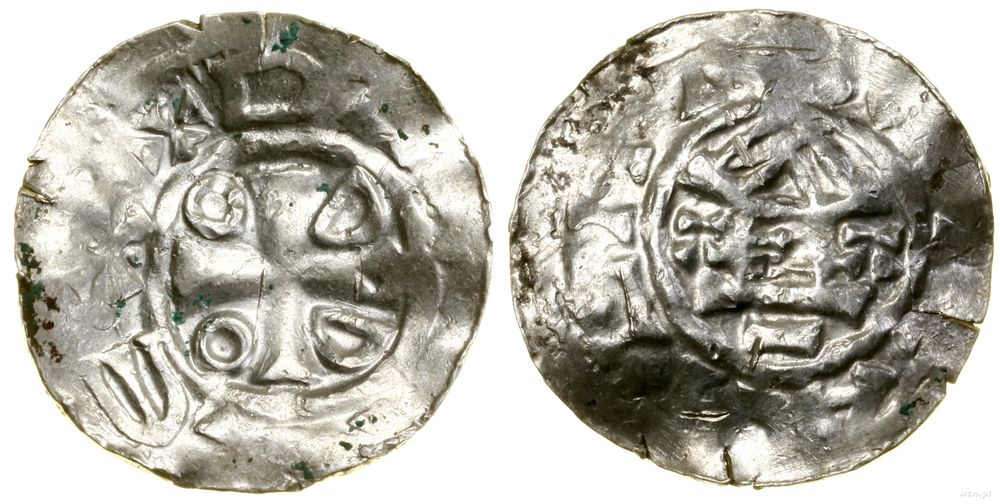 | Opis: | Niemcy - Saksonia - Otto III (983–1002), denar typu OAP, Aw: Krzyż, w kątach O-D-D-O, legenda, Rw: Kaplica z poziomymi belkami, wewnątrz kulka, po bokach Λ - Λ, legenda |