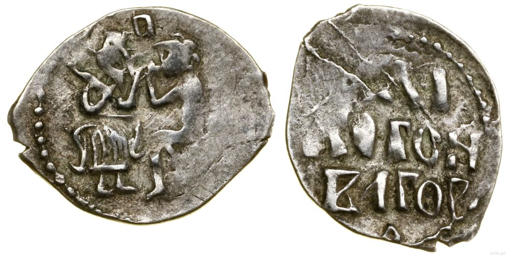 | Opis: | Ruś - Nowogród, dienga, (1420–1456), Nowogród, Aw: Książę siedzący na tronie przyjmujący hołd od poddanego, nad nimi litera П, Rw: Poziomy napis |