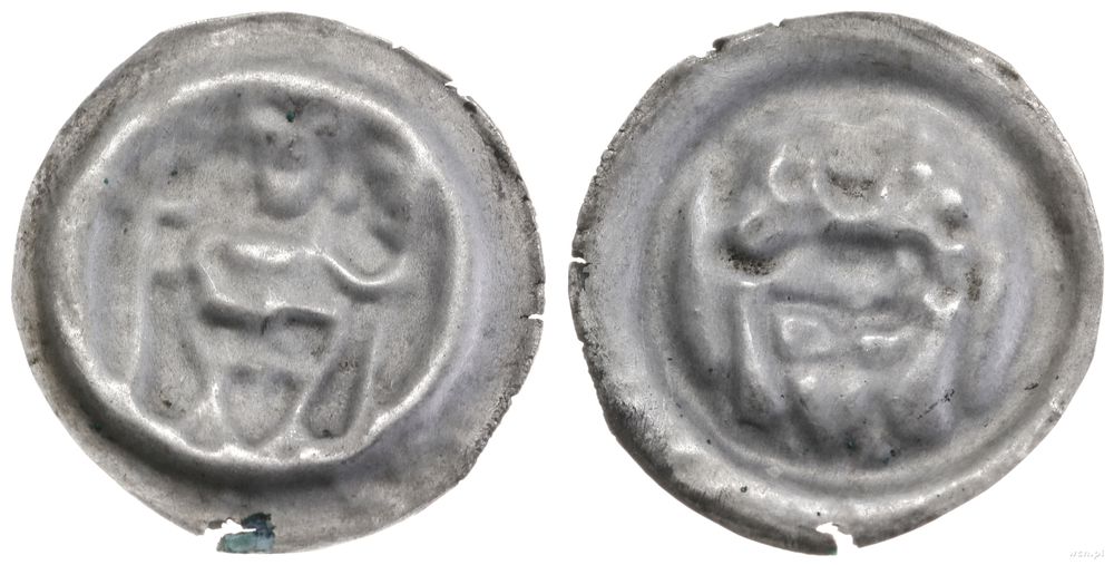 | Opis: | Zakon Krzyżacki, brakteat, ok. 1247–1258, Długowłosa postać rycerza, trzymająca prawą ręką tarczę, na której krzyż, w lewej ręce proporzec płachtą skierowany ku głowie, z lewej strony wolnostojąca laska krzyżowa |