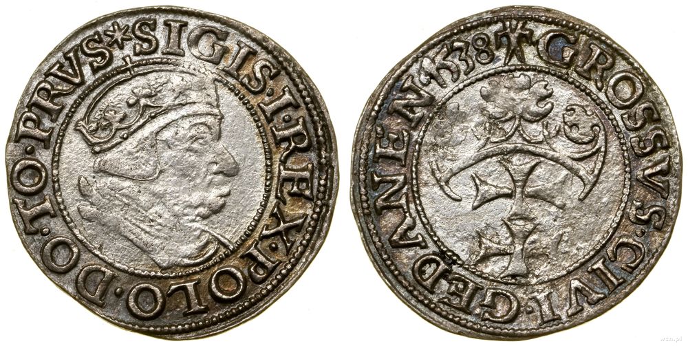 | Opis: | Polska - Zygmunt I Stary (1506–1548) - miasto Gdańsk, grosz, 1538, Gdańsk, końcówka napisu PRVS, na awersie gwiazda, na rewersie haki |