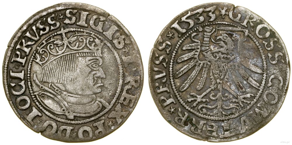| Opis: | Polska - Zygmunt I Stary (1506–1548) - monety pruskie, grosz, 1533, Toruń, końcówki legend PRVSS / PRVSS |