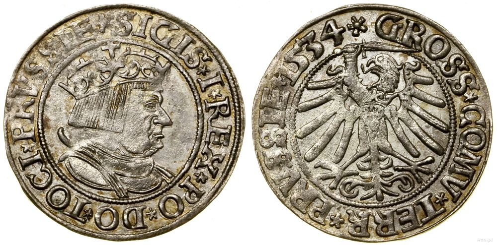 | Opis: | Polska - Zygmunt I Stary (1506–1548) - monety pruskie, grosz, 1534, Toruń, popiersie władcy w czepcu i koronie, końcówki legend PRVSSIE / PRVSSIE |